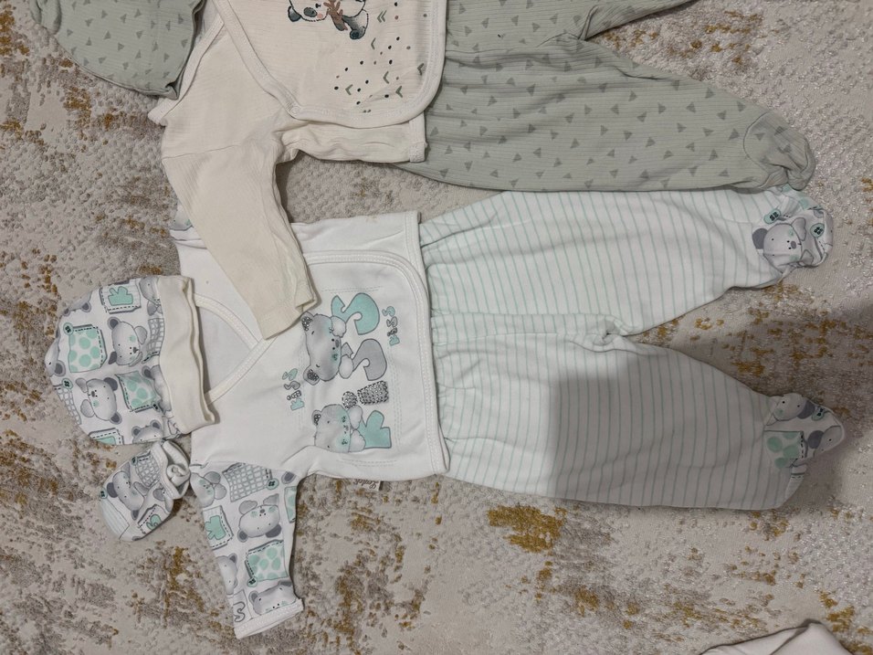 Bebek erkek için beyaz, askısız ve düğmeli kısa kollu pamuklu üst ile pastel çizgili yumuşak pantolon takımı.