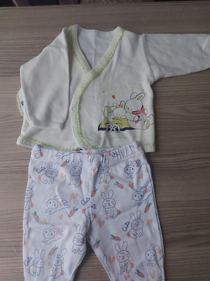 Pamuklu, uzun kollu, düğmeli üst ve tavşan ile havuç desenli pastel renkli pantolonlu bebek erkek takım. 0 3 aylık dönemde kullandık