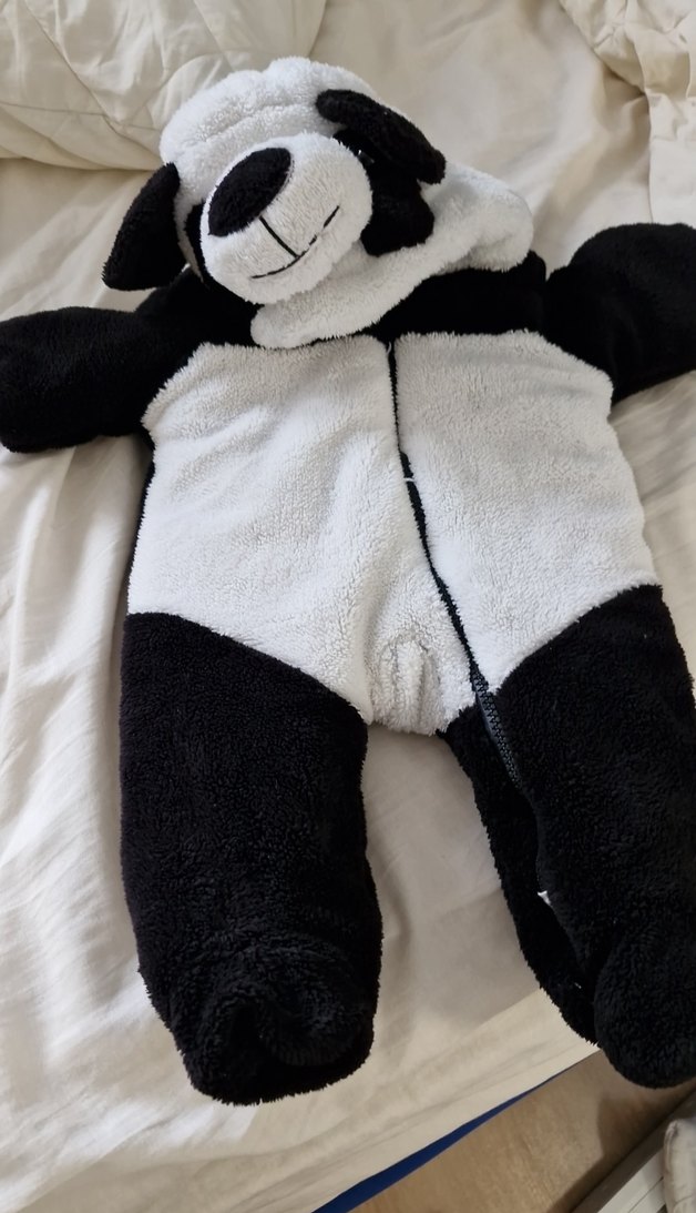 Bebek erkek peluş kumaştan yapılmış, kürk detaylı kış tulumu. Siyah beyaz renklerde, desensiz ve gotik tarzda. panda