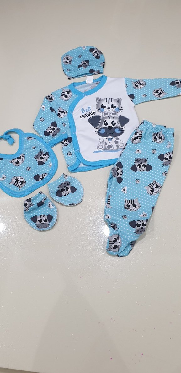 0-6 ay için uygundur mavi tonlarında, uzun kollu, biyeli ve sevimli kedi-köpek desenli hastane çıkışı seti, şapka, eldiven ve önlük ile tamamlanmıştır. tam 5 parça penye kumaş set takım