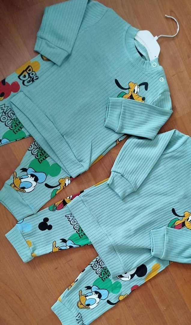 Mavi renkli, örgü uzun kollu bisiklet yaka üst ve renkli baskılı polar pantolonlu bebek erkek streetwear takımı.