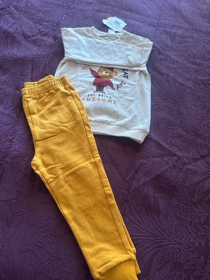 Beyaz, baskılı uzun kollu üst ve sarı pamuklu pantolondan oluşan, pastel renklerle rahat ve şık bebek erkek takımı. Ürün hiç giyilmedi . 18-24