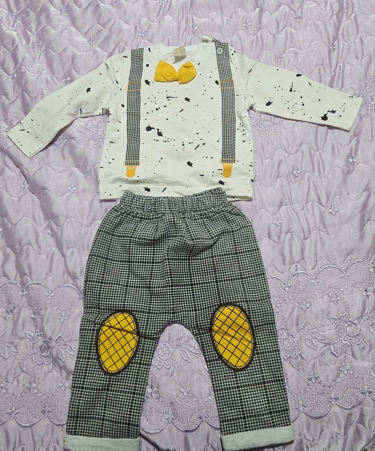 Uzun kollu, bisiklet yaka ve batik desenli, sarı yamalı ekoseli pantolondan oluşan bebek erkek takımı. Yumuşak sentetik kumaştan üretilmiştir.