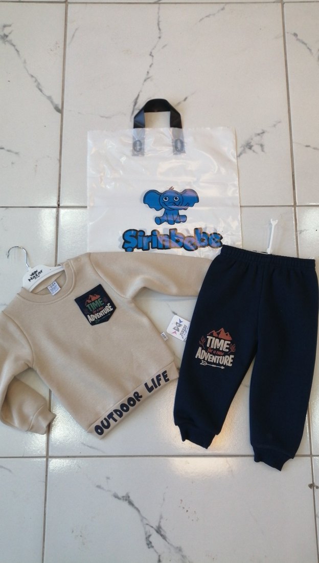 Uzun kollu, yumuşak ve sıcak kumaştan yapılmış bebek erkek takımı, baskılı macera desenleri ve cırt cırtlı detaylara sahiptir.