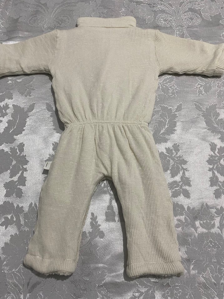 Bebek erkek için beyaz ve gri tonlarda, triko dokulu yumuşak keten kumaştan üretilmiş, düz desenli kışlık tulum. ❄️