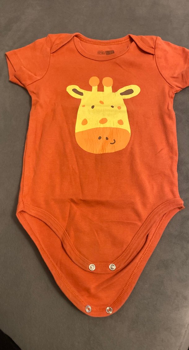 Renkli zürafa baskılı, kısa kollu, turuncu bebek erkek body. Yuvarlak yakalı ve alt kısmında çıtçıtlı, yumuşak ve sıcak kumaştan yapılmıştır.