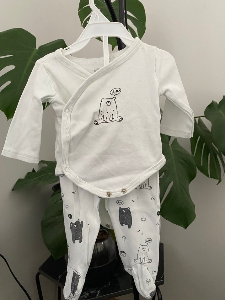 Beyaz pamuklu uzun kollu üstü düğmeli, altı gri baskılı ayıcık desenli bebek erkek takımıdır.