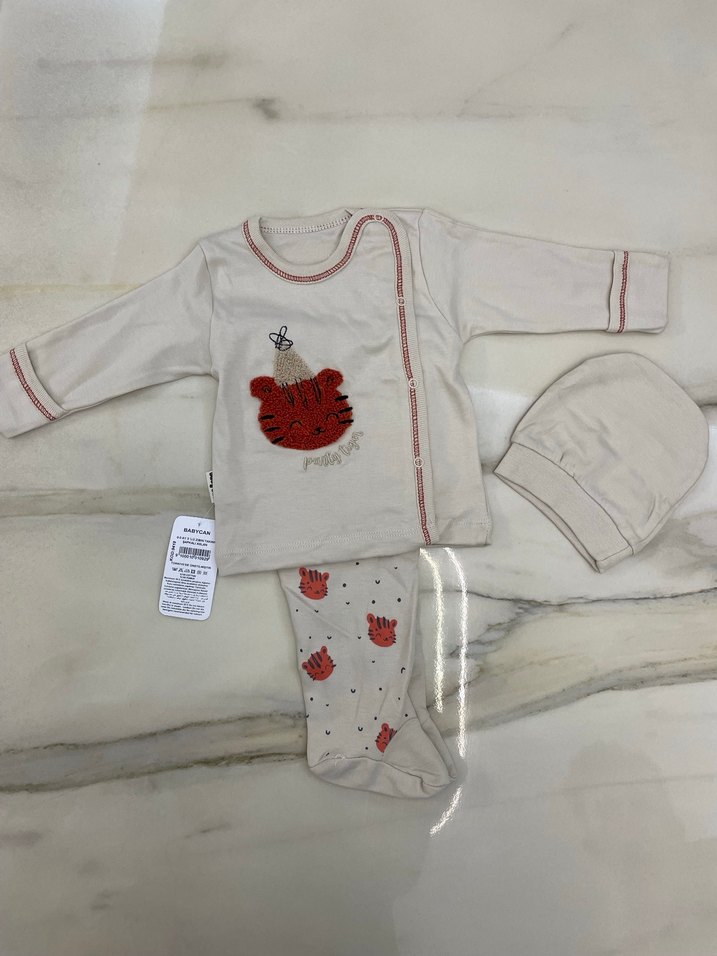 Uzun kollu beyaz üst, kaplan baskılı pantolon ve örgü şapka içeren, yumuşak ve sıcak kumaştan bebek erkek takımı. Rahat yuvarlak yaka.