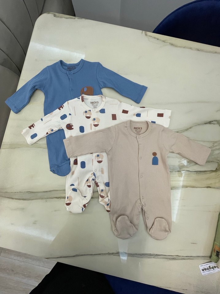 Bebek erkek için pamuklu, uzun kollu ve bisiklet yakalı üçlü tulum seti. Pastel renklerde baskılı ve sade şık tasarıma sahiptir.