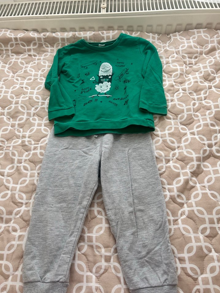 Uzun kollu yeşil baskılı üst ve gri örme pantolondan oluşan, yumuşak ve sıcak kumaşlı bebek erkek eşofman takımı.