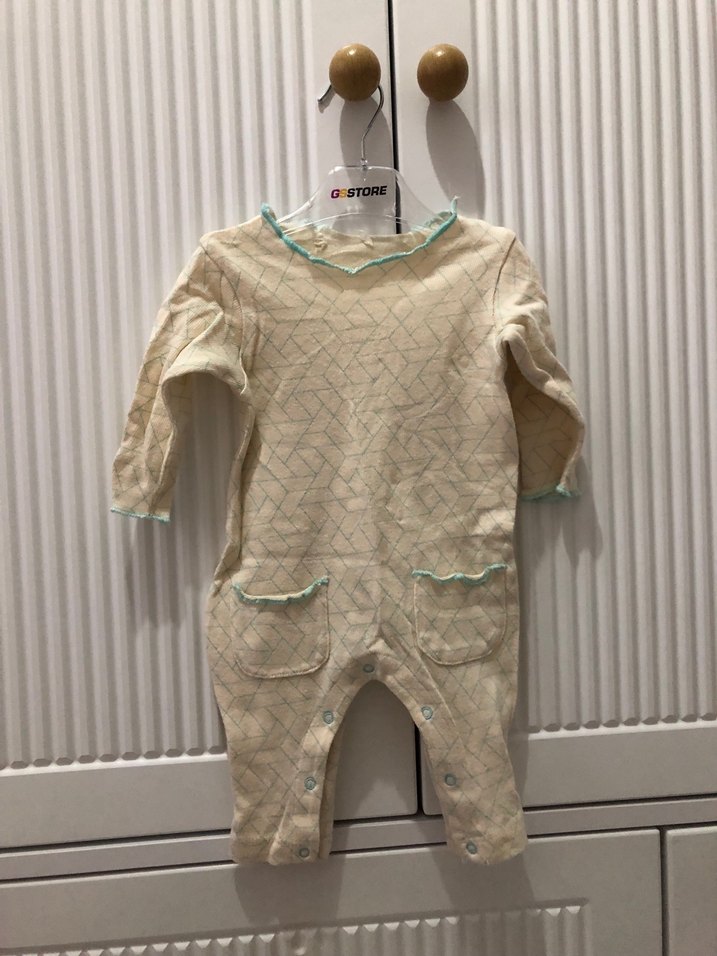 Bebek erkek için uzun kollu, yuvarlak yakalı pamuklu örgü tulum. Pastel tonlarda, iki küçük cepli ve çıtçıtlı kapanışlıdır.