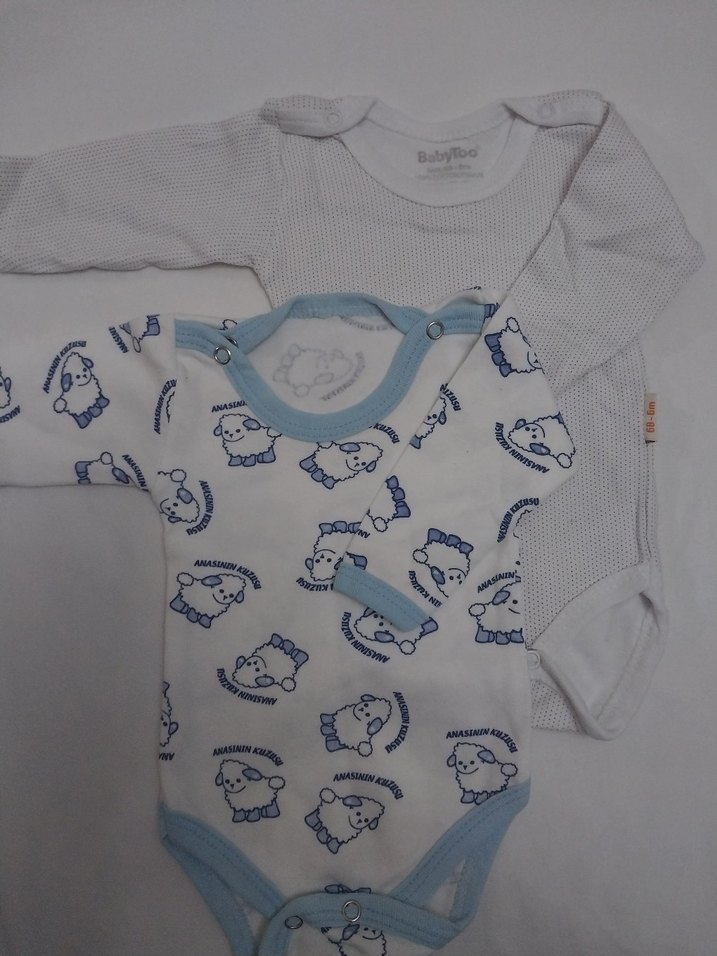 Beyaz örme ve mavi koyun desenli baskılı, uzun kollu, yuvarlak yakalı iki bebek body seti, yumuşak ve rahat kumaşlıdır.