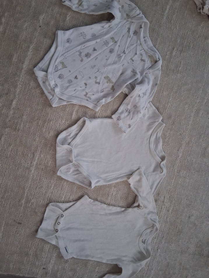 Yumuşak pamuklu kumaştan yapılmış, beyaz ve gri tonlarda üçlü uzun kollu bebek erkek body seti. Rahat ve sade tasarım.