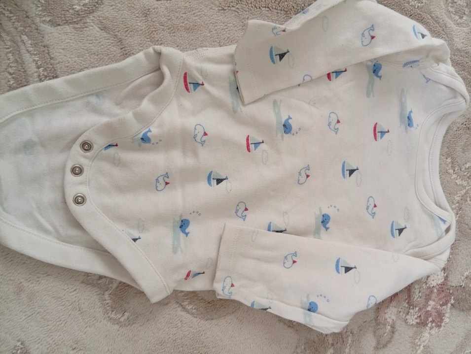 Pamuklu, uzun kollu, bisiklet yaka bebek erkek body. Pastel beyaz renkte, yelkenli ve balina baskılı, düğmeli detaylıdır.