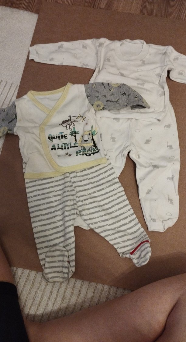 Bebek erkek için pamuklu, uzun kollu, baskılı ve beyaz-gri renkli kıyafet seti. 0-3 aylık bebek için. fiyatı uygun tutuyorum ihtiyacı olan alsın diye.