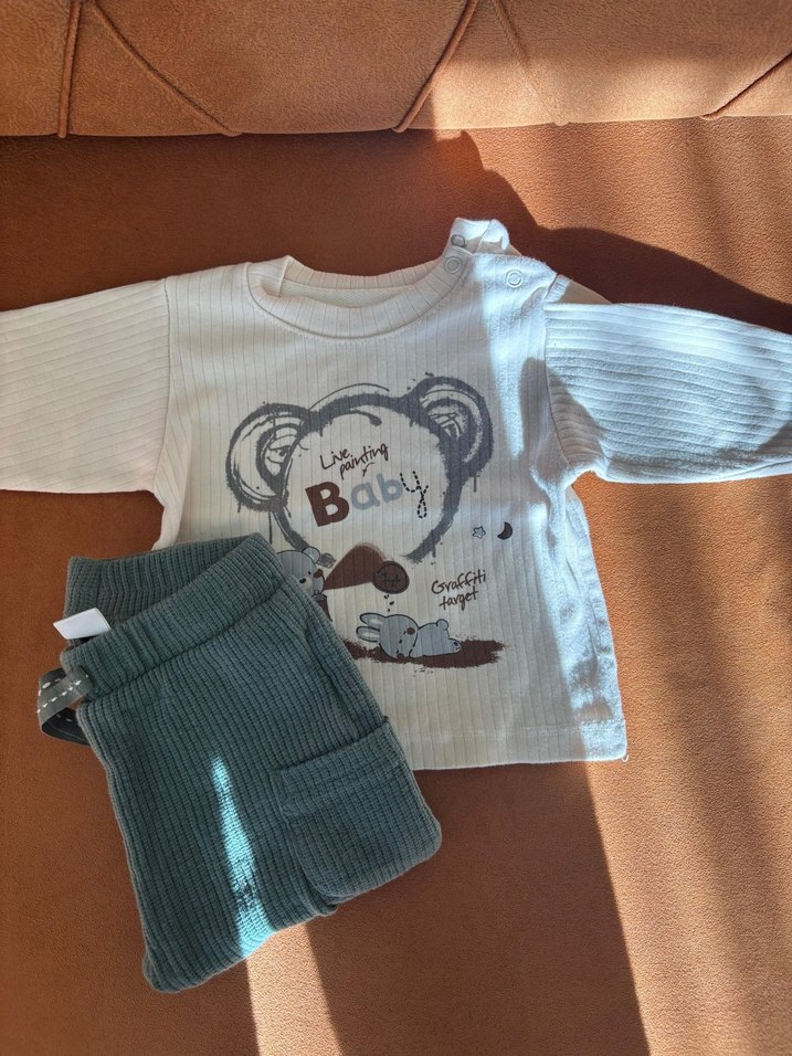 Beyaz uzun kollu, yuvarlak yaka, örme pamuklu üst ve yumuşak pastel renkli pantolonlu bebek erkek takımı. Rahat ve günlük sokak giyimi tarzında.