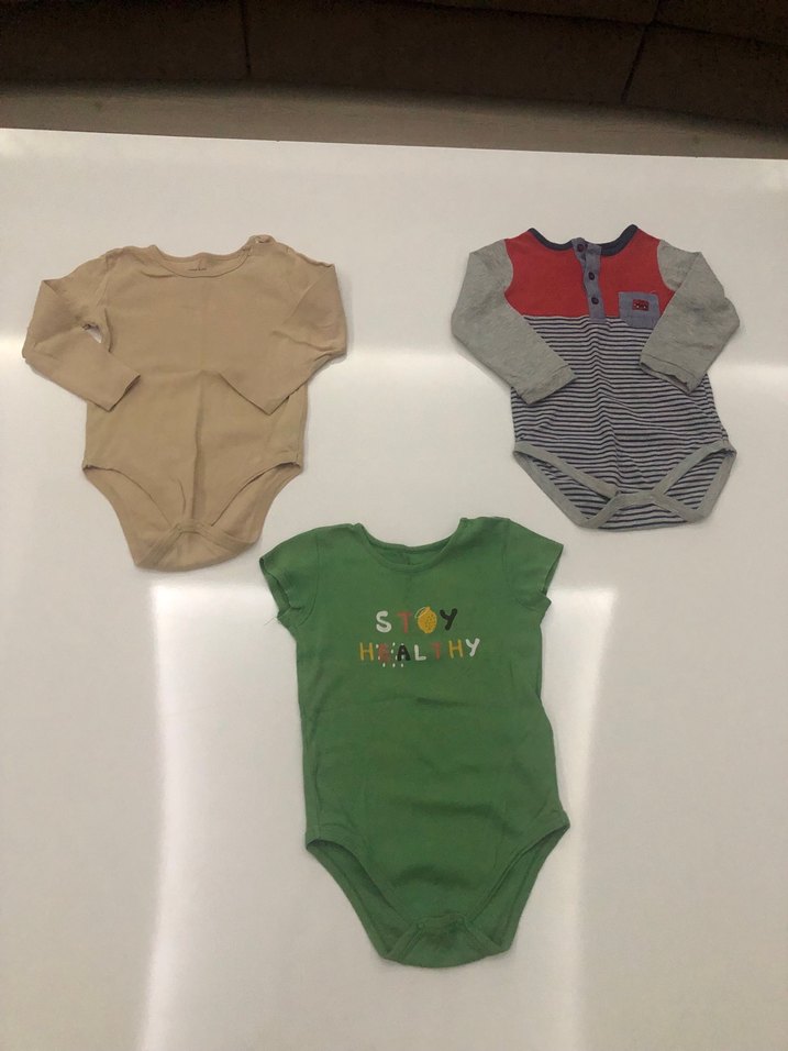 Uzun kollu, yuvarlak yakalı üç renkli bebek erkek body seti. Yeşil body üzerinde renkli 'STAY HEALTHY' yazısı bulunur.