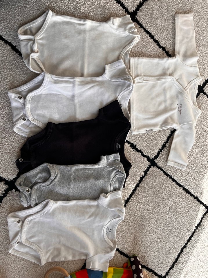 H&m ve kitikate markalı. 0-1 ay ve 0-3 ay olma üzere, Beyaz ve gri renklerde, pamuklu kumaştan yapılmış, uzun kollu ve straplez yaka bebek erkek body. Normcore tarzında, zahmetsiz şıklık sunar.