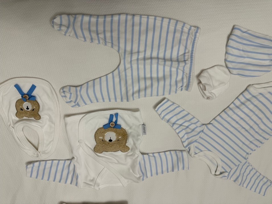 Bebek erkek için uzun kollu, yuvarlak yaka, yumuşak pamuklu kumaştan yapılmış, pastel mavi çizgili set. Sadece birkaç kez kullanıldı zıbında leke mevcut. Önlük Şapka ve eldiven hiç kullanılmadı. Toplu alım yapmalı isteyenlere özel 10 lu 0-3 ay uyumlu çorap hediye gönderiyorum