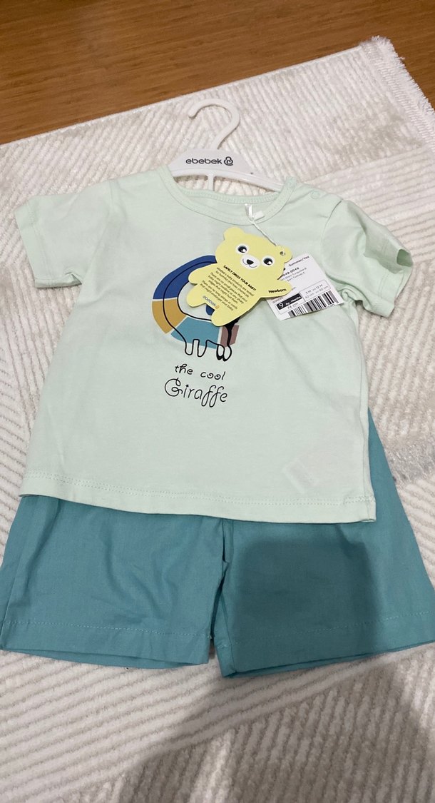 Bebek erkek için pamuklu, kısa kollu yeşil üst, baskılı zürafa figürü ve yuvarlak yaka. Mavi rahat şort ile tamamlanmıştır. 9 ay