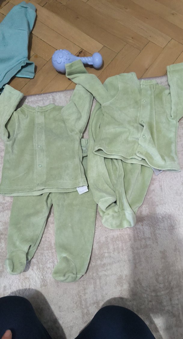 Pastel yeşil renkte, uzun kollu ve boğazlı bebek erkek takımı. Rahat pantolon ve düğmeli üst parçadan oluşur. İki takım biri yenidoğan diğeri 3 ay için