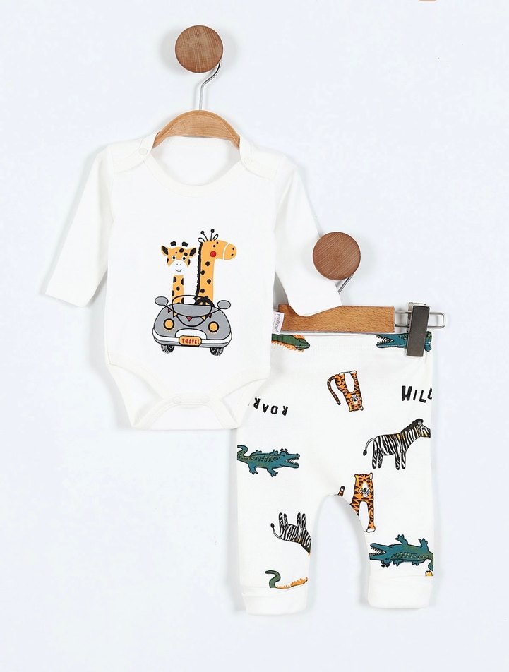Beyaz kısa kollu pamuklu zıbın, üzerinde zürafa baskısı ve çeşitli hayvan desenli pantolon ile bebek erkek takımı. Yuvarlak yaka ve yumuşak pamuklu kumaş rahatlık sağlar.