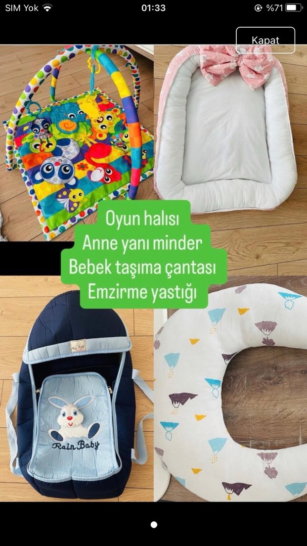 Canlı renklerde sentetik kumaştan yapılmış oyun halısı, emzirme yastığı, bebek taşıma çantası ve anne yanı minder seti. Bebek eşyaları toplu satış 500+500 tl 1000 tl hepsi