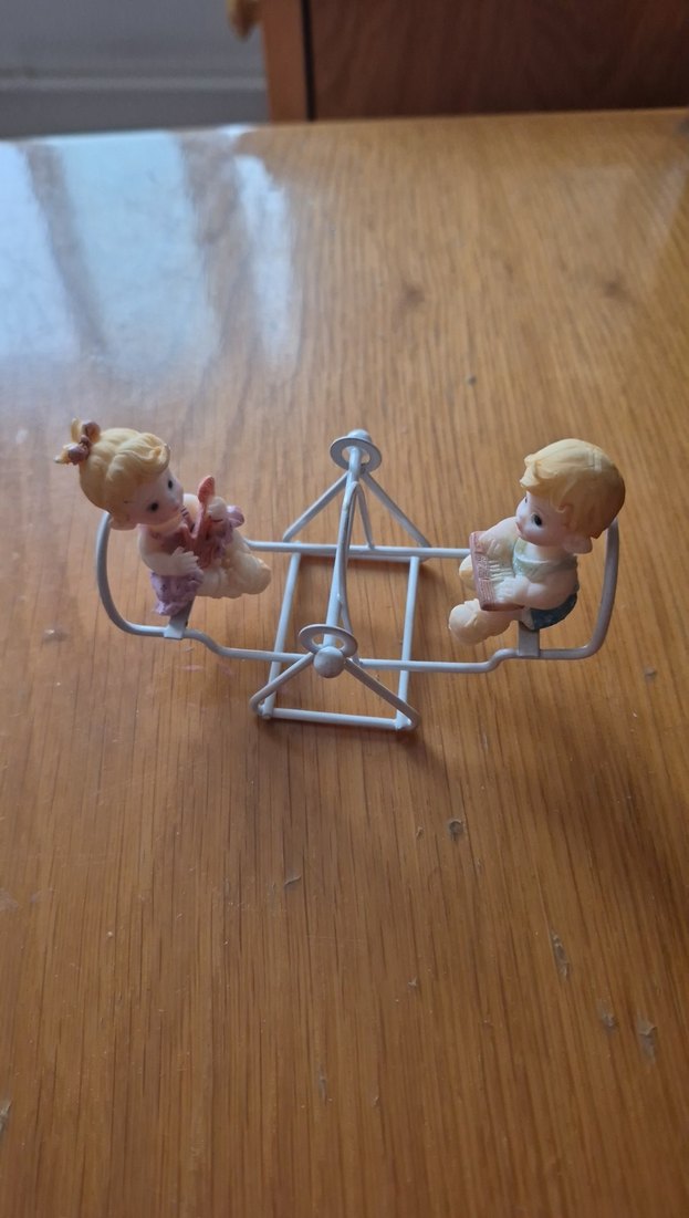 Pastel bej renkte, beyaz metal çerçeveli, iki bebeğin salıncakta oturduğu oyuncu anı yakalayan biblo.