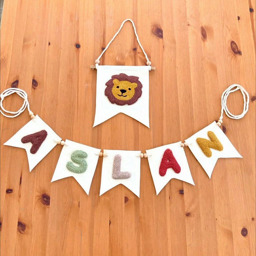 verilen fiyat harf tane fiyatıdır Renkli nakışlı triko harfler ve asılan aslan figürlü çocuk odası duvar süsü. İsim yazılı ve eğlenceli tasarımlı.