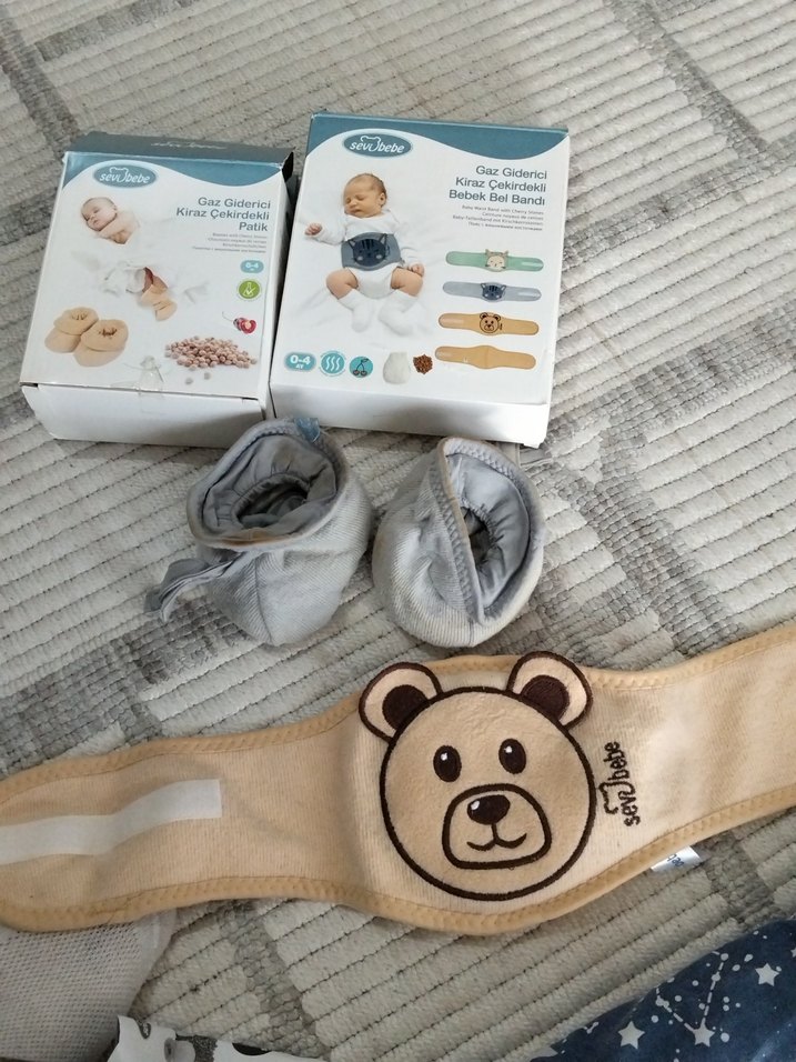 Gri yumuşak kumaştan bebek patikleri ve camel renkli, ayı desenli gaz giderici bebek bandı seti. patik kullanılmadı denedım biraz yandı ama yanık lekesı çıkar