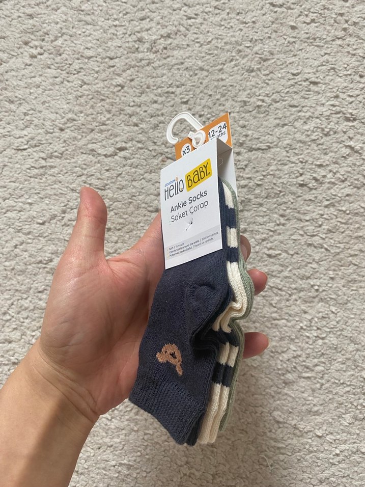 12-24 ay erkek bebekler için gri desenli soket çoraplar, Ebebek etiketli ve üçlü pakette. Küçük ayaklar için rahat uyum sağlar. E bebek