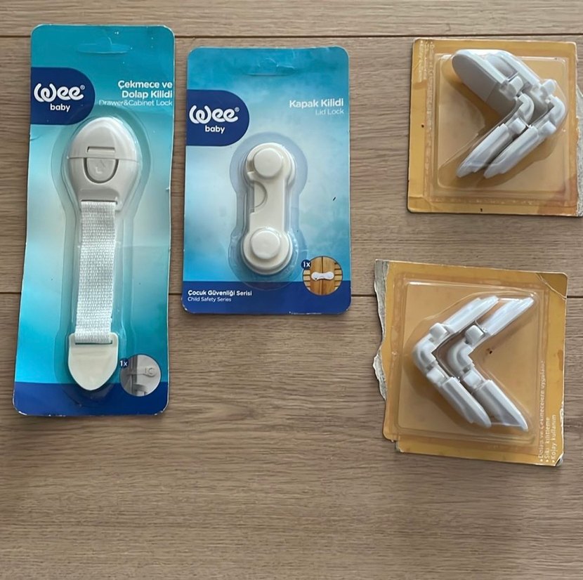 Beyaz renkte, dolap ve çekmeceleri güvenli hale getiren çocuk güvenlik kilitleri seti. 4 lü köşe kilidi. 2 tanede çekmece ve dolap kilidi olarak toplam 6 parçadan oluşur.