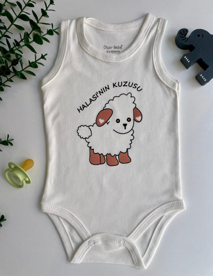 Kolsuz, sevimli kuzu baskılı bebek body. Yumuşak ve rahat pamuklu kumaş.