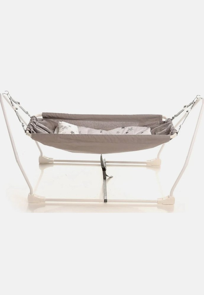 Gri renkli bebek hamağı, sağlam metal çerçeve ve yumuşak kumaş yatak ile rahat uyku alanı sunar. Nazik sallanma özelliği bulunur. ️Sağlam defosu yok.