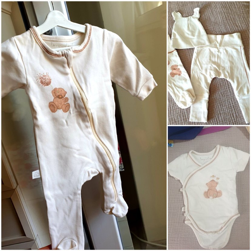 bebek üst ve pantolon takımı, çoraplarda hafif ayıcık detayıyla pastel tonlarda rahat ve şık bir görünüm sunar. hastane çıkışı. tinylamb marka bebek cok çabuk buyudugu için fazla giyilmedi.takim fiyatidir