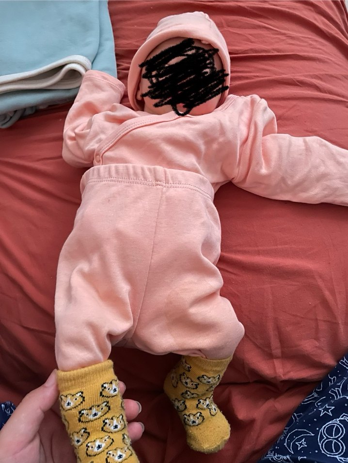 Pastel pembe renkte, bebegim 10 gunlukken giydirmistim fotoda. Eldivenleri ve sapkasi yok esofmani patikli