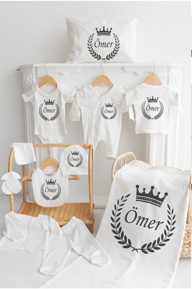 Kısa kollu, pamuklu, beyaz bebek hastane çıkışı. Gri renkte "Ömer" baskılı, modern klasik tarzda. hazırlanma kargo süresi 20 gündür 11 parça settir