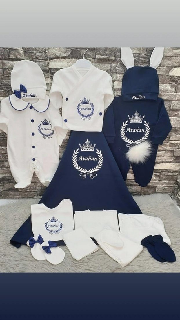 Modern klasik stil, uzun kollu ve örgü pamuklu kumaşlı bebek hastane çıkışı takımı. Üzerinde 'Atahan' baskısı ve beyaz ile koyu mavi renkler bulunur. 11 veya 13 parça olarak değişmektedir hazırlanma süresi kargo ile beraber 10 gündür
