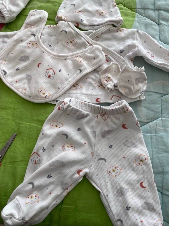 Bebek hastane kıyafeti uzun kollu ve örgü dokuludur. Pantolon, üst, şapka, önlük ve eldiven içerir, açık beyaz renkte hafif desenlidir.