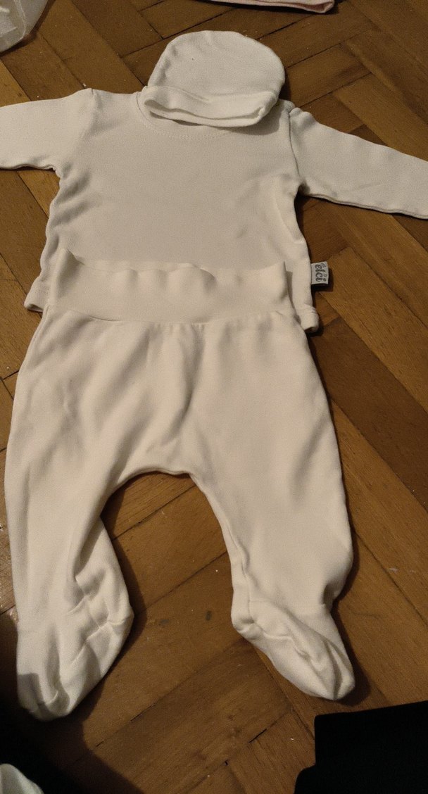 Uzun kollu, yumuşak ve sıcak kumaştan yapılmış beyaz bebek hastane kıyafeti, rahatlık sağlar.