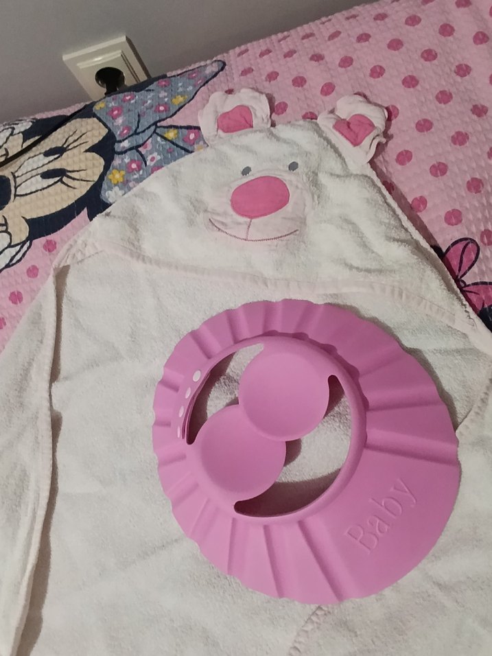 Yumuşak kapüşonlu ayıcıklı bebek havlusu ve göz koruyucu şampuan başlığı seti. Banyo sırasında gözleri korur.