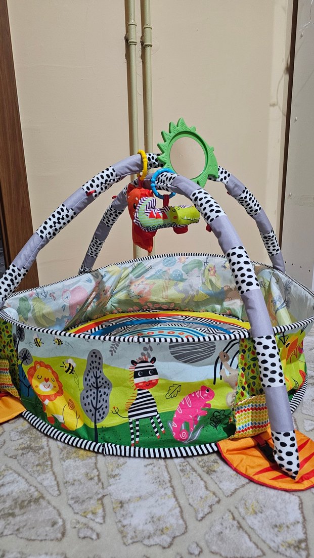 Sentetik kumaştan yapılmış, renkli ve hayvan desenli bebek oyun halısı. Asılı oyuncaklarla bebeğin ilgisini çeker. Yumuşak ve güvenlidir.