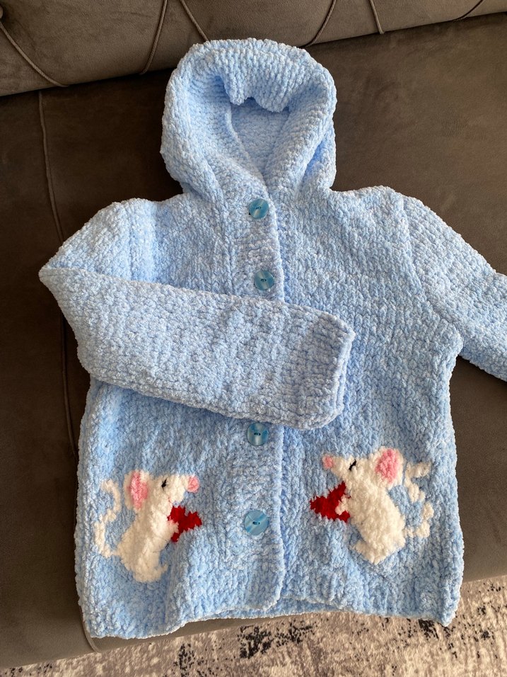 Uzun kollu, kapüşonlu erkek çocuk hırkası, yumuşak mavi örgü kumaştan yapılmıştır. Önünde düğmeler ve nakışlı fare desenleri bulunur. Sıfırdır. El emeğidir. Boy:43 cm En:37 cm 6-18 ay arası rahatlıkla olur
