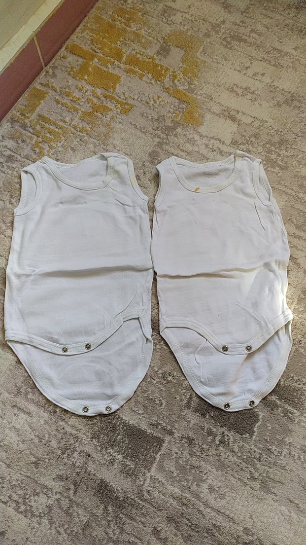 Yumuşak kumaştan yapılmış, alt kısmında çıtçıtlı iki adet beyaz kollu bebek iç çamaşırı. Üst üste giymek için uygun.
