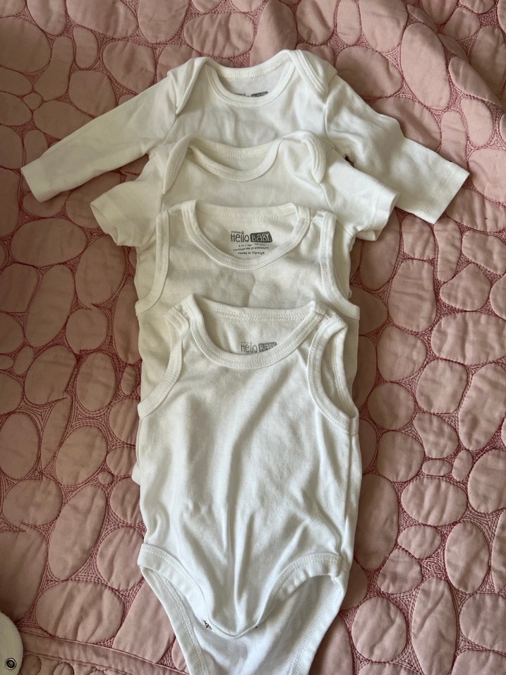 Pamuklu, beyaz bebek iç çamaşırları seti; farklı kol uzunlukları ve rahat yuvarlak yaka ile normcore tarzında, zahmetsiz şıklık sunar. Yenidoğan bebeğim 2 aylık olduğu için küçülenleri uygun fiyata satıyorum . #bebek #yenidoğan Ebebekten aldım.