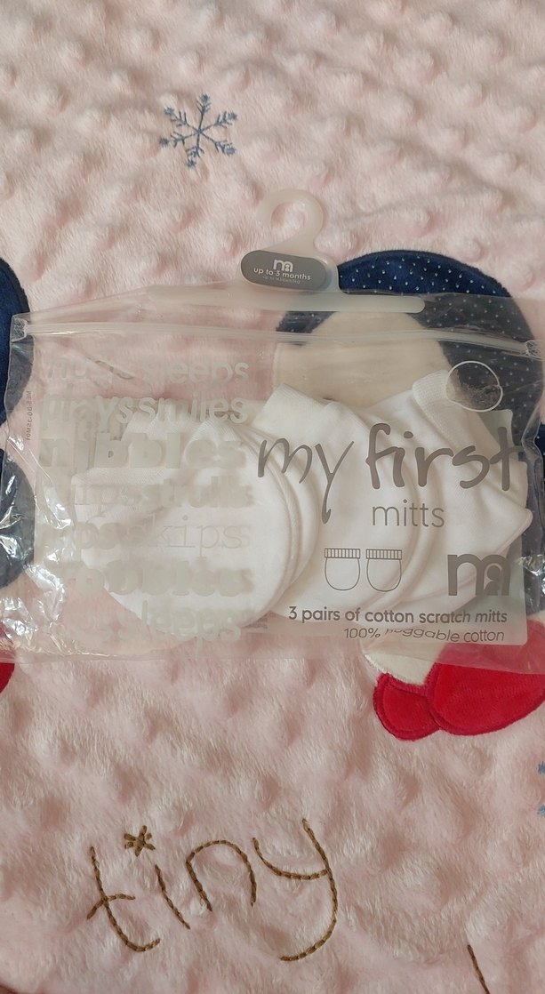 Bebeğin cildini korumak için 100% yıkanabilir pamuktan yapılmış, beyaz renkte 3 çift pamuklu bebek eldiveni seti.