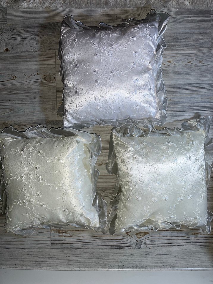 Üçlü beyaz dekoratif yastık seti, gri tonlarında nakışlı desenlere ve narin fırfırlı kenarlara sahiptir. Yumuşak kumaş ve ince işçilikle şık bir görünüm tekli ya da ikili veya üçlü satılabilir tanesi 150 tldir