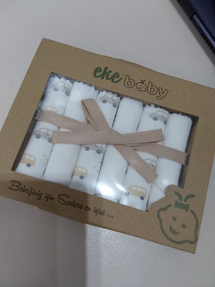 Yumuşak kumaştan yapılmış, açık renk baskılı ağız mendili bebek seti. Hediye paketi için kurdeleyle bağlanmıştır. İçerisinde 6 adet bulunmaktadır