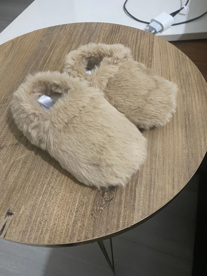 Bebekler için bej renkli, yumuşak kürk detaylı ve içi sıcak tutan terlikler. Ev içinde ayakları sıcak tutar.
