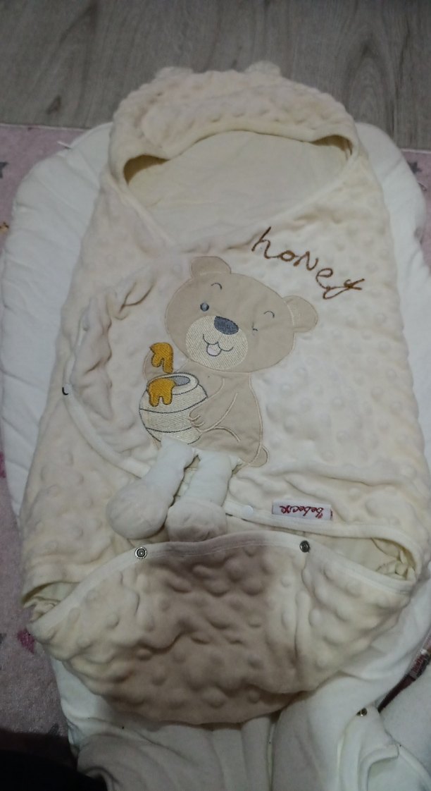 Peluş kumaştan yapılmış, beyaz renkli, pastel tonlarda ve ayı desenli yumuşak çocuk battaniyesi.
